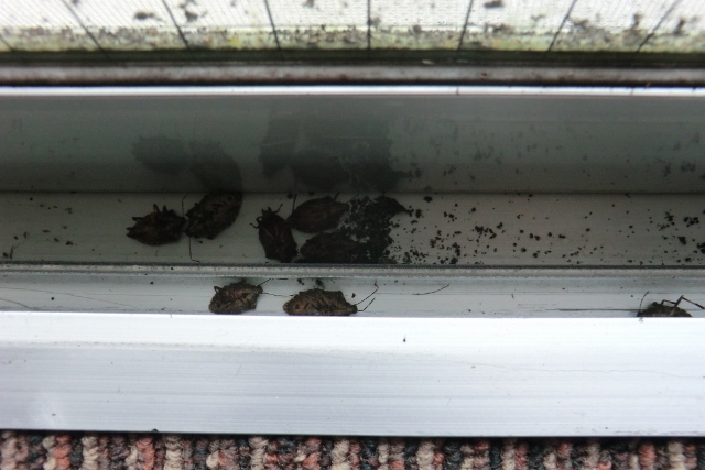 さらにカメムシが窓ガラスに付着していることもあります。この場合も「水で薄めて散布する殺虫剤」で対処できなくないものの、「窓ガラスが白く曇る」や「サッシ周りにべたつきが残る」などの理由であまり推奨しません。